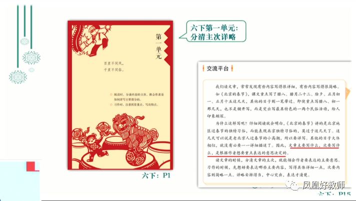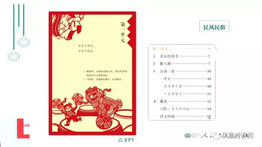 我们六年级下册 “民风民俗”单元,虽然是老舍写的《北京的春节》、沈从文先生写的《腊八粥》,可能跟我们孩子的生活稍微有一点距离,但是我们反而可以从那个时代和现在的对比中,更能够体会到文化的延续、传承和变迁。