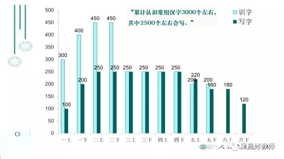 后面呢,我会用一定的线索来帮大家看一下它们是怎么串联在一起的。这里边我做了一个关于识字写字的一个图表,来看一下我们关于识字写字的安排。因为这是一个小问题,特别是到了中高年级识字写字也不是重点。但是我想这个图表,可以帮助我们整体上去把握整套教材的识字和写字,字种的数量的安排。低年级按照要求来说,识字量和写字量都比较大。那么到中年级,相对来说比较均衡。到高年级,特别是到了六年级,已经没有是安排识字,只有写字。