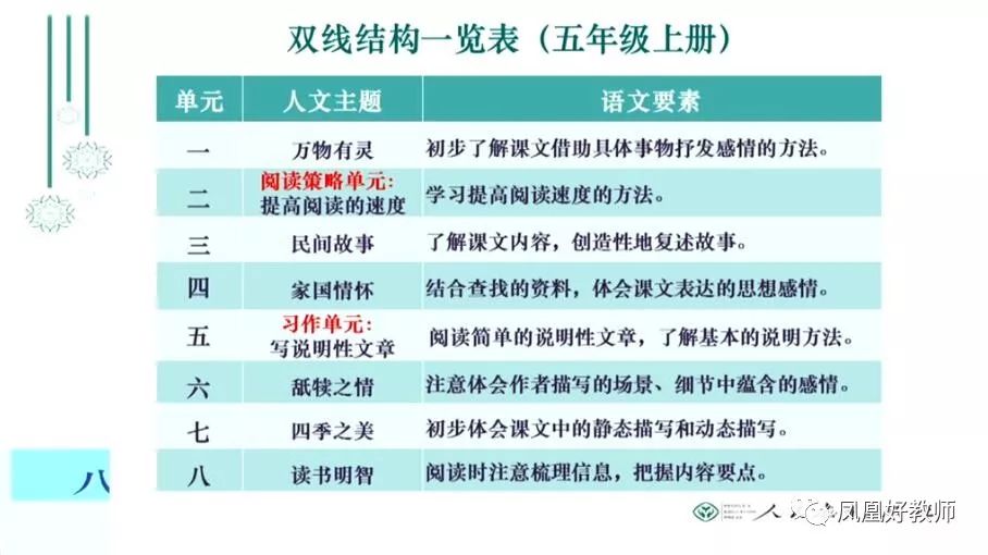 在谈论这几个特点之前,我想还是给介绍这个双线结构一览表。因为时间关系,我就不会一个一个地去说,就考察大家的快速阅读的能力。我们五年级上册有一个单元叫“提高阅读的速度”,那大家就迅速地浏览一下。