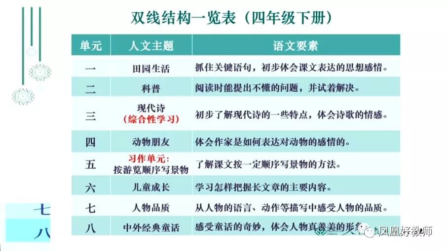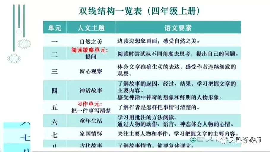 四年级上册就是非常初步的怎么样整体把握课文内容的一些方法,所以老师们可以看到这套教材非常凸显的特点就是语文要素。这些语文要素指向什么呢?就是指向我怎么读懂一篇文章。我们希望学生在阅读的时候,除了读懂这一篇文章,除了读懂那一篇文章,他还知道我怎么读懂这一类文章。就是通过一个单元的学习,让学生知道这一类的文章或者遇到这样的情况,我以后可以用这种方法来读,就可以有迁移运用的价值。所以每一个单元都有每一个单元的收获。以前我们讲一课一得,当然现在我们还是一课一得,但是现在每个单元也有每个单元整体上的一个收获。