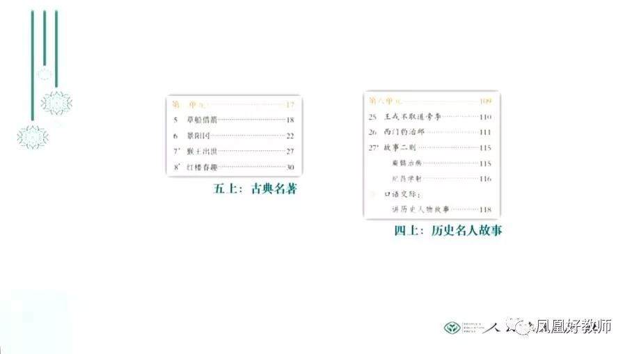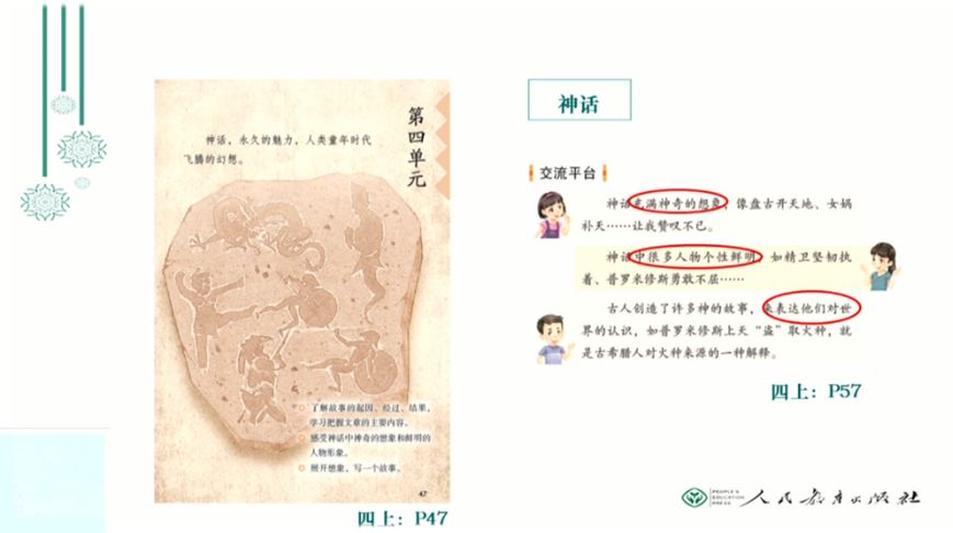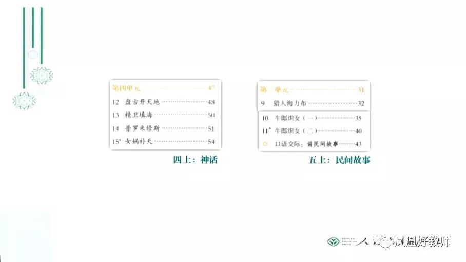 除了以上内容,我们还有一些单元,我想也是非常明确地去传承我们的中华传统优秀文化。比方说四年级上册的“神话”单元,我们选择的有三篇都是中国神话。《女娲补天》《盘古开天地》《精卫填海》,都是最经典的,其中《精卫填海》是文言文。比方我们流传至今的“民间故事”《牛郎织女》《猎人海力布》。我想这里边所蕴含的文化元素,也值得我们的学生代代地传承下去。
