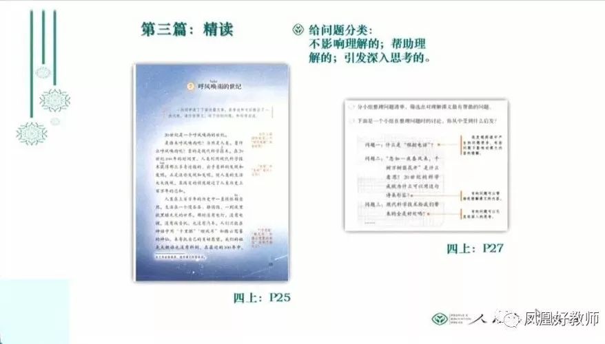 要是学生一提问,老师说你怎么这么二啊,提个这么傻了吧唧的问题,那可能小孩儿就会受打击,本来我们就是鼓励学生提问。不同的学生有不同的思维层次、不同的认知水平,所以他就是应该是千差万别,不同层次的。我们要尊重学生的这些问题,但是我们可以通过简单的梳理引导学生,你以后提这样的问题更能帮助你理解课文,这样他就知道今后怎么样提出更有价值的、更好的问题,我想我们的意图应该是在这里。就是既保护学生提问的积极性,又在这个基础上给他一些指点。你要提出那样的问题,那就更有价值,更能够帮助你深入理解课文了,所以这里边有三类:一类不影响理解;一类能帮助理解;还有一类能引发你深入思考。