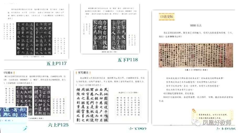 非常巧,我们选择的这几篇文言文,都反映了古代的传统艺术,比如古琴、国画,还有围棋。那传统书法呢,我们在高年级有一个呈序列的安排。像低年级的书写提示,我们重在引导学生怎么写好字:先是笔画笔顺,然后是间架结构,然后行款整齐,等等。到高年级,我们有一些审美的、欣赏类的书写提示,就是欧体、颜体、柳体、赵体,正好是五年级四次引导学生欣赏这些最经典的书体,让学生有一个初步的了解,受到美的熏陶。
