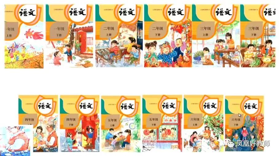 这是我们十二册教材的封面。这个封面呢,老师们可以看到它的整体设计理念就是传统文化。传统文化里边蕴含的元素,也是非常的丰富。既有关于节日的,比方说过年了,要贴春联,然后端午节的时候要怎么样;也有一些关于民间工艺的,比方说捏泥人、皮影戏等等;然后还有窗花、宫灯。我们一眼看过去,就是可以受到感染的一幅幅图画。