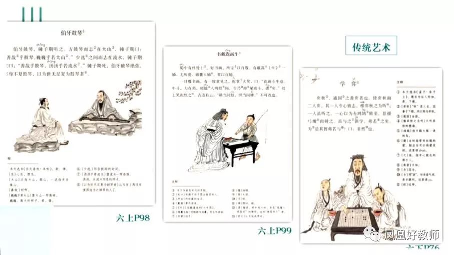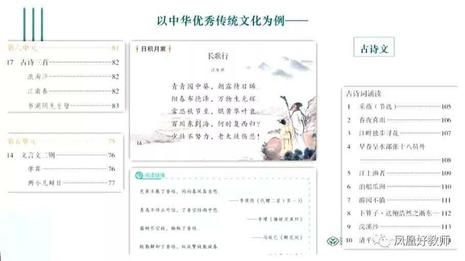 大家肯定第一反应,传统文化就是古诗文。我想这可能是很多人下意识的反应,所以古诗文在这套教材里非常丰富。它的丰富性呢,也体现在各个方面,一个是数量比较多,还有一个就是它安排的这个板块所在的位置也比较多,有的是以课文的形式出现,有的是在“日积月累”里,有的是在“阅读链接”里。六年级下册,我们还专门安排了一个版块叫“古诗词诵读”,给学生提供更多的机会。