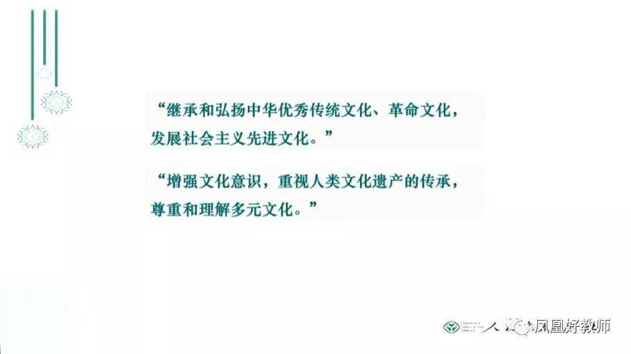 高中课标里关于文化的说法,有这样几点,一个是中华优秀传统文化,一个是革命文化,一个是社会主义先进文化,以及后面提到的多元文化。因为时间关系,我就只以中华优秀传统文化为例,来谈一下我们教材的基本安排和我们的设想。