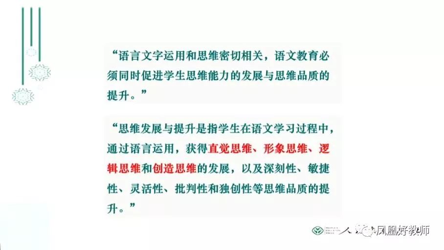 第二点,思维发展。我这里引用的也是高中课标的一段话,对于语言文字和思维的关系做了一个简单的说明——语文教育必须同时促进学生思维能力的发展与思维品质的提升。我想,这个应该是我们所有语文人达成共识的一个观点:语言能力的发展应该是伴随着思维的发展,伴随着思维品质的提升。它们两个应该是如影随行,密不可分的。