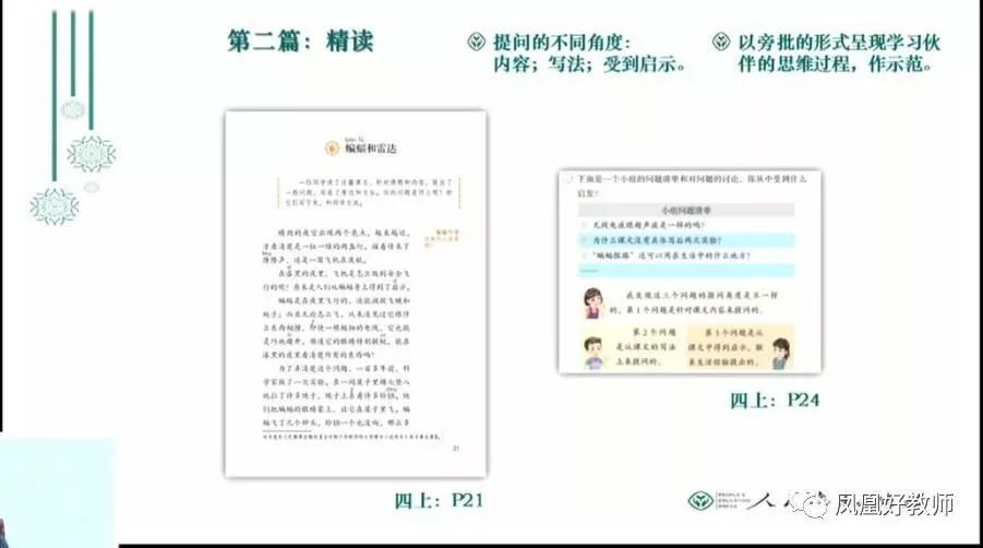 我个人是不太建议让学生一边读课文一边读旁批。我现在也依然是这个观点。为什么是这个观点呢?我觉得是基于一个基本的理念,就是学生对于方法的学习和建构一定是建立在自己真实的阅读经验的基础上。就是你一定是自己去读,自己去完成一个任务,在这样的一个前提下,然后我再来看我读得好不好,我任务完成得好不好,任务完成得不好,那我就看一下旁批这个小伙伴儿读到这儿的时候是这么做、这么想的。他读到那儿的时候是那么预测的,我都没想到原来小伙伴还可以这样来学习。就是从自己的阅读经验和一个我们认为相对比较成熟的比较好的阅读者的经验之间的差距,他看到这个中间的这个差距,那么他去看到原来他用的是那种方法,我可以学习,我可以借鉴,我下次在阅读的时候我可以这样来做。所以就是每一篇,像那个陈老师上午列了个表格,他说每一刻怎么样来推进,但是不管他是怎么样的一个推进的一个方式,每一篇都一定是让学生先自己来读,自己来体验,然后才来在这个过程中学习方法,我想这个是我的一个思路,提出来跟老师们交流。
