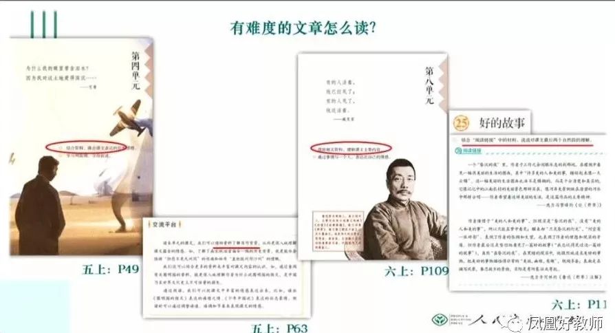 有难度的文章怎么读?希望给学生一些挑战,不过这些挑战也是客观的,因为学生平时一定会遇到。遇到什么样的情况呢?就是这些课文超出他自己的经验范围,有的是因为时代久远,背景不了解,所以读不懂;有的可能是因为语言文字,语言表达比较晦涩,比方说那个文白夹杂的,还有鲁迅的一些文章,这种可能学生就不容易理解。我们提示的一个思路是什么呢?就是结合资料来阅读,借助资料来阅读。