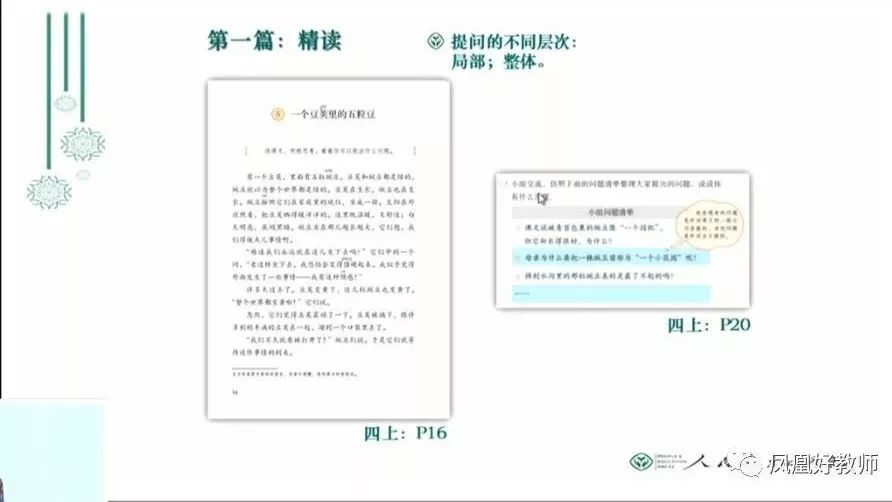 第一篇:精读。我们就说提问。那肯定是学生要自己要边读边提问,提问的时候他最后看到这些问题就可以发现提问是有不同层次的。一般大多数孩子第一次来做这件事情没有意识的话,提的都是局部的问题。有的是关于词句,有的是关于段落的等等,关于整体的问题可能会比较少。所以我们在课后去引导学生用这样的一个题目来发现。我发现我们提的问题有的是针对一部分内容提出的,有的是针对全文提出的。所以就让学生知道你以后在提问的时候你也可以从不同的层次去提。除了你以前习惯的那种,就是从局部一些细节的一些疑问来提,那么你以后也可以想想关于全文,你有什么问题。