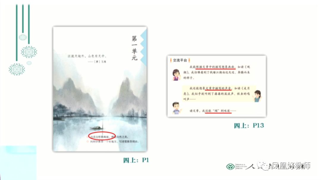 成单元做的有这样几个,一个是四年级上册“边读边想象画面,感受自然之美”。这个单元的课文好像有《观潮》《走月亮》这几篇,是非常适合想象画面的。那我们在交流平台里边就有这样的提示——根据文章中的描写想象画面。关于“想象画面”,孩子从二三年级就一直有这样的提示,让学生去做。那在这里边,他的提升在哪里呢?“我还能想象到文章中描写的声音。”就是学生好像听到了潮水扑面而来的声音,包括里边的“人声鼎沸”等等这样的语词,都是非常容易唤起学生的生活体验去发挥想象的。另一个小朋友说:“我还能闻到味道。”我们的想象,就不止于这种静态的画面,就是好像我们传统意义上理解的去读文章、想像画面,把这些文字再转换成画面。作者是看到画面,把它转换成文字。那我们呢?看到文字,再去还原画面。