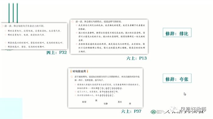 修辞。比方排比,比方夸张。关于修辞,我想多说一句。我们更多的不是让学生去辨别这个到底是排比、夸张、比喻,还是拟人,更多的是希望学生能够在读的时候体会到它的表达效果,而且体会到表达效果之后,能够模仿着去运用。这个是我们的指向,而不是像考试题里边模棱两可的比喻句、拟人句,一定要去说一个结果。还追着我不依不饶地说,“徐老师你一定要告诉我这句话到底是比喻句还是拟人句,我们办公室已经打起来,打了一上午了”。我希望不要出现这样的情况,一定是在运用中引导学生体会修辞的作用在哪里。我们的课标里面说的是指向语言文字的运用,所以一切都要落在运用上面。对它的分析,对它的辨识,可以作为它的前提,但是有的时候如果我们只是去分析辨识,而对运用没有帮助的话,那我们就要舍弃那个部分,我们要去考虑它的价值到底在哪儿?