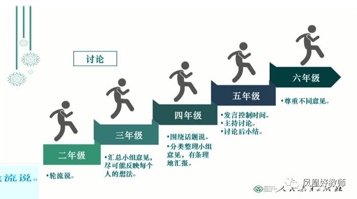 这是关于“讨论”我们的一个序列,其它的所有线索,我们都可以列出这样的序列。因为我们觉得“讨论”特别重要,让学生能够在相对正式的场合,围绕一个真实的话题展开讨论。从低年级最简单的“轮流说”,到后面围绕话题做主持,然后去梳理大家共同的意见等等。每一个年级都有不同的讨论话题,都有不同的要素安排它。纵向的梯度在这里,给大家了解一下。