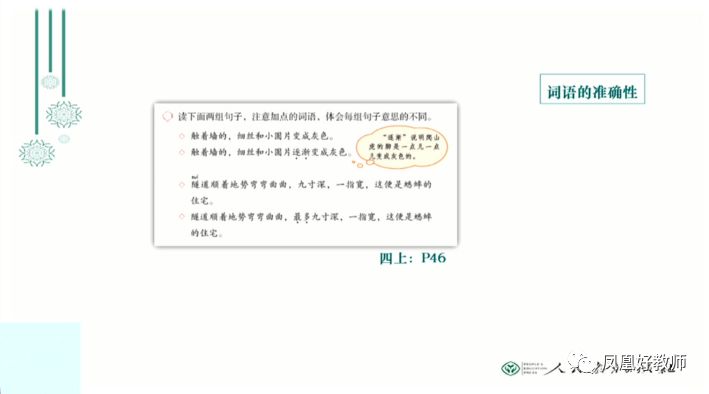 比方写具体,我们结合课文中的引出的例子,引导学生从各个方面写心理活动,写一个场景,写关于时间漫长等等。引导学生知道怎么样把一个细小的片段写得更具体,更有吸引力。四年级上册还有这样的题目,体现用词的准确性。《爬山虎的脚》这一课,“触着墙的,细丝和小圆片逐渐变成灰色。”“逐渐”就说明它是一点儿一点儿变成灰色的。这样的描写一个是说明他观察特别细致,连续观察,还有一个说明它的用词非常精准。让我们的学生知道词语的使用,有的时候你写完了之后要去读一下,你要有一个“炼”字的一个过程。让他去体会我写了这个地方,就能够准确地表达我想表达的意思。