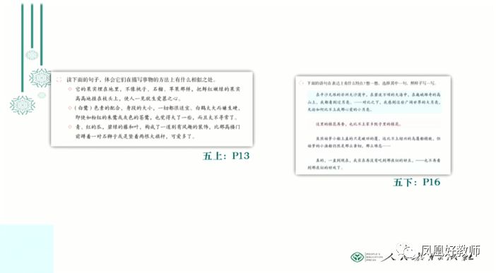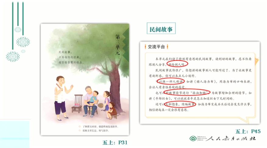 我们可以看到,包括叶老《牛郎织女》这篇,当时有很多文字,我们就觉得是不是还是应该改一下,后来保留它口头文学的特点。我们的这个民间文学是用文字记录口头文学,所以它的这种口语语体色彩还是非常鲜明的,所以在这个单元里面,我们就是让学生讲故事,口耳相传,去体会这种民间故事的特点,然后还可以添油加醋去讲,还可以讲不同的版本,这也是民间故事的特点。叶老的《牛郎织女》的故事跟其它那些版本的差别很大,我们选择的这个版本相对来说比较适合给小孩子讲。