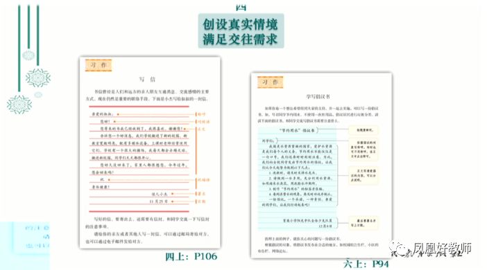 第四个,创设真实情境,满足交往需求。写信、写倡议书,我们都会提示一个具体的情境给学生,让学生来写。需要关注的是,格式只是其中的一个方面,更重要的还是在内容本身。你写给谁呢?你为什么要写?你要表达的内容是什么?你向别人倡议什么?应该是在这个过程中,要把这些想清楚,把内容写清楚才是主要的。格式是很容易学会的,但是它的内核、它的实质还是在它的具体内容上。