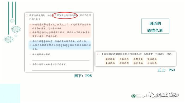 词语的感情色彩。前面我们所说的那个单元都是明贬实褒的表达方式,四下和五上还分别有这样的练习,让学生去体会不同的词语,它其实是有不同的感情色彩的。有的就是用于你喜爱的人,有的就是用于你不喜欢的人。