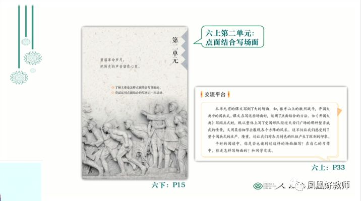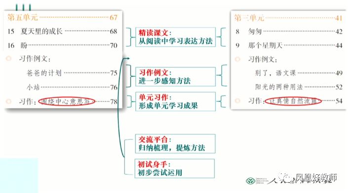 这是它的一个整体架构。这个架构可能不如有的老师做得那么清晰,但是大体上也能看出来,它的内容安排。先是从精读课文里学表达方法,然后交流平台、归纳梳理,最后来习作例文,来形成单元学习的成果。
