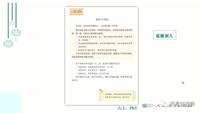 还有口语交际,去说服别人。所以口语交际,我们光看那个话题,有的时候看不出它的功能,实际上每一个话题我们都可以界定它的功能。《请你支持我》就是典型具有说服别人的功能。比方说服妈妈,我要养条狗;说服校长,我要办一个什么活动等等。类似这样的一些情况,引导学生先说想法,再说具体的理由,这是一个特别常规的表达方式,不要啰里啰嗦说了一大堆细节还没进入重点。要让学生从小就有这样的意识,让他们知道怎样表达才能更好地跟别人沟通。