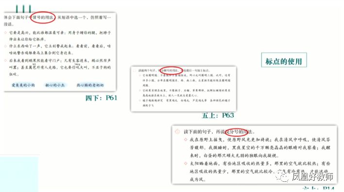 标点的使用。四年级以上冒号、顿号、分号的用法。我觉得标点的使用其实不只是标点,它里边也蕴含着思维的价值。为什么这么说呢?因为分号、冒号,我们想一下,它其实体现的是对于句子结构的逻辑关系的表达。这个句子是这样的一个逻辑,所以你要用冒号去引出下文;句子是一个并列关系,所以你要用分号去做一个间隔。当然,我们不是去讲这种复句的关系,但是我们在用的时候,要让学生去体会,这几个句子用这个为什么更合适。
