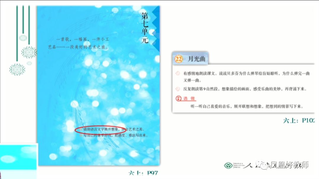 第七单元也是借助语言文字展开想象,这里边就又有一点拓展,除了借助文字想象画面,那后面我们还有类似这样的引导学生展开想象的内容要选做:听一听自己喜爱的音乐,展开想象和联想。实际上,音乐是很富有画面感的,除了语言文字可以激发我们的想象和联想,音乐同样可以做到这一点。所以我们希望有这样的一些活动,引导学生知道他也可以这样去尝试、去运用。