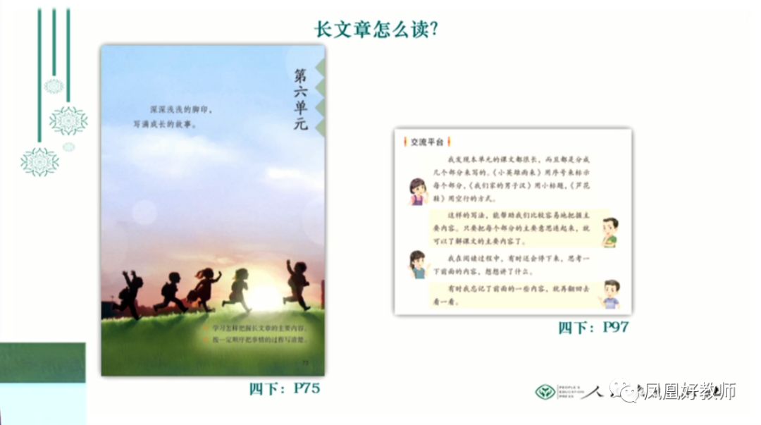 但实际上我们觉得在现代社会,我们现代儿童的阅读应该不止于这种短篇课文的阅读,在我们的教学里边应该纳入一些长篇的阅读,可能不同于传统的精读课文,我们可以有不同的处理方法引导学生来学习。长课文怎么读?我们在四年级下册专门有一个单元引导学生来了解遇到长的课文怎么去理解它。