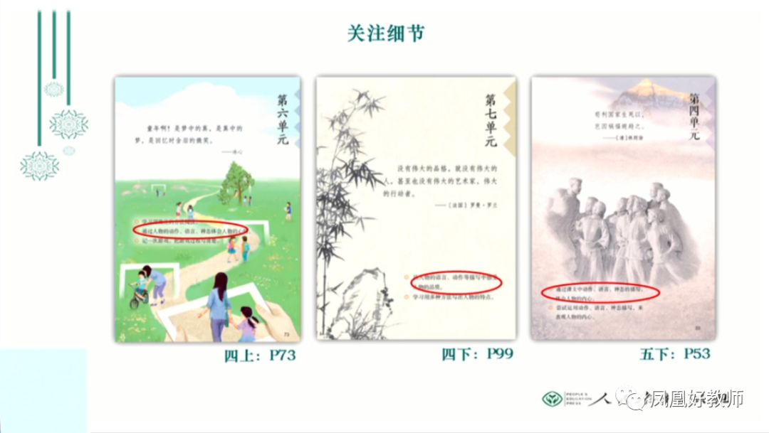 除了把握整体,下一个应该就是关注细节,这个我想可能体现的就是我们教科书里面整体和局部的关系。我们在教学的时候可能也要去关注这两点。“关注细节”这个部分很多都是怎么样去通过人物的动作、语言和神态来关注。这个也很好理解,因为我们的教材里面,对小学生来讲,可能阅读的大量的都是叙事类的文本,写人写事的。叙事类的文本,写人写事,它就脱不开这样的几点——通过人物的动作、语言、神态体会。最早一个是体会人物的心情,心情就稍微浅一点,到后来就是感受人物的品质,就要去提炼这个人到底是坚强勇敢的,还是什么其他品质的,学生要去提炼。再往后就是体会人物的内心,他的心理活动。我们反过来在后面有练习,就是你如果是这样的心情,你怎么样通过你的语言和动作去表达它、去写它。所以这个也是相辅相成的,读的时候我们这样去读,那么写的时候我们可以照着这样来写。
