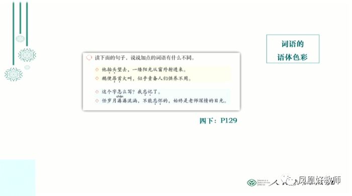 词语的语体色彩,这个主要是口语和书面语。那我们这里边,可能不是让学生真正地能去用或者是能去辨识,但是让他有一点这样的意识,初步地了解。比方“抬头”和“昂首”,平常我们口语可能不会说到“昂首”这样的词。我以前认识一个新加坡人,我们一起共事过。他说话非常的书面语,以前我没有意识到我们还可以用书面语来说话。我们可以尝试一下,如果我们平时把这些语词(加以运用),比方说“你在那儿昂首做什么”,我不知道对方可能会怎么样。我们这样尝试去体会一下,我觉得真的蛮有意思。就是它其实运用于不同的语境。当然,说的太多就会更高,但是让学生去体会一下。举点好玩的小例子,让学生去体会不同的词语,它看起来是近义词,平常我们可能就当近义词去填一下,但是近义词和近义词的使用是完全不同的,使用于不同的语境,它有不同的适用范围。