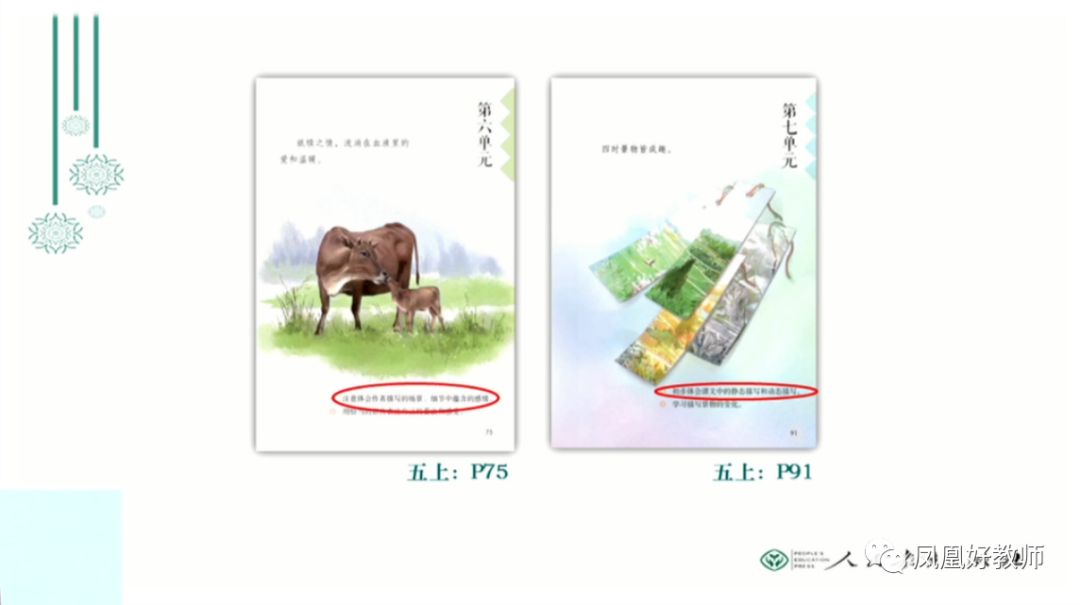 这里边的这两个,一个是“注意体会作者描写的场景和细节中蕴含的情感”,一个是“体会课文中的静态描写和动态描写”。上一屏可能主要是针对叙事类的文本,那么这一页的两个,一个是针对抒情的散文,另一个是写景类的散文。场景和细节蕴含的情感,这里边的几篇文章也是特别的适合,《慈母情深》,还有吴冠中的《父爱之舟》,非常的好,虽然有难度,当时我们觉得《父爱之舟》这篇文章很有难度,但是真正读起来,然后去把握里边每一个场景所体现出来的浓浓的父爱,真的是非常打动人。所以让我们的学生从场景、从细节入手,去体会这里边的情感。