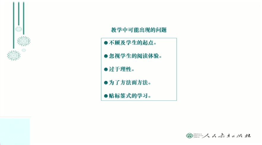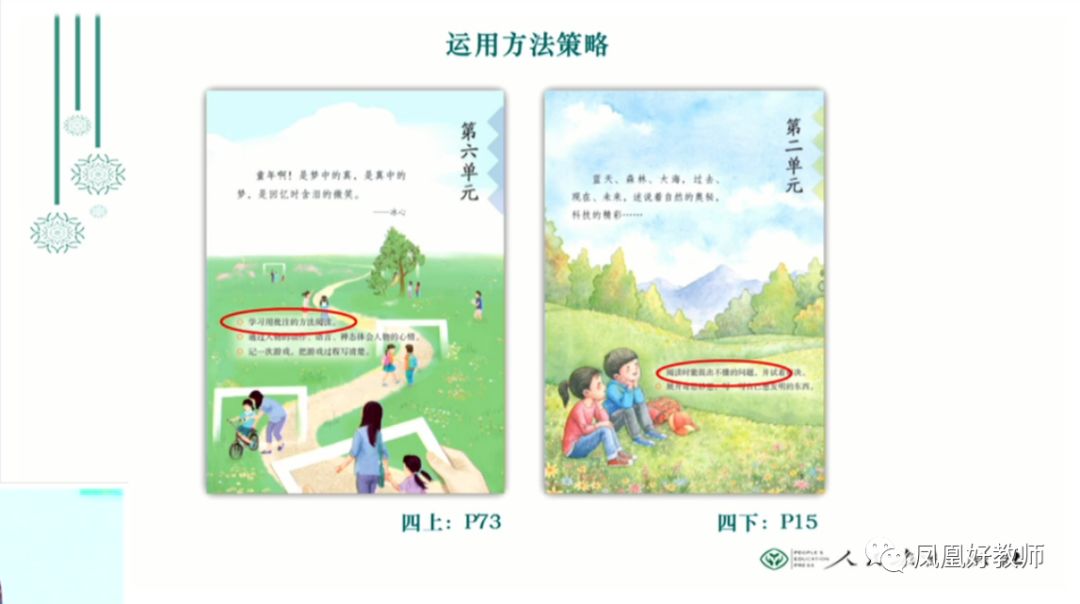 为了方法而方法,贴标签式的学习,这两个我觉得好像已经有一些苗头,甚至有的地方会比较严重。在这个单元也体现出来,在一些其它的语文要素的单元也体现出来。就是好像觉得把方法的这两个短语、这两句话写在黑板上,学生就记住,然后就去说“我是用这种方法,他是用那种方法,我是怎么样的,他是怎么样的”,用这样的一种方式来学习。所以,方法的学习是为了什么,我们一定不要忘记,最终还是为了理解,为了阅读。所以我们如果是把方法作为目的本身,那就是本末倒置了,一定要把方法的学习和阅读理解有机地融合在一起,把这个方法含而不露地放在我们整个阅读教学过程中,带着学生去读,在学生理解出现问题的时候、出现状况的时候去点播方法,让学生恍然大悟:“原来这样做就可以更好地读。”让学生能够在这样一个真正体验阅读乐趣的过程中学会运用方法,我觉得这个可能是我们所追求的一个目标。就是不要觉得方法很重要,方法的位置在哪里?我们还是要去找准它。