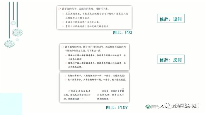 修辞、设问、反问。你看我们都是指向运用的,这个反问我们提供了两个情境。反问句一般来说是要慎用,反问是很伤人的。很多人喜欢用反问句,然后把别人伤了自己还不知道。如果你真的想用反问句去怼人,那你就大胆地用;如果你本来没打算怼人,但是不小心用了反问句,那可能就会造成交际上的问题。所以在这里,我们设计了两个情境,让学生去尝试,去看一下,你觉得用反问句好还是用陈述句。