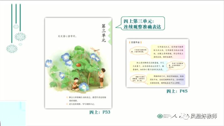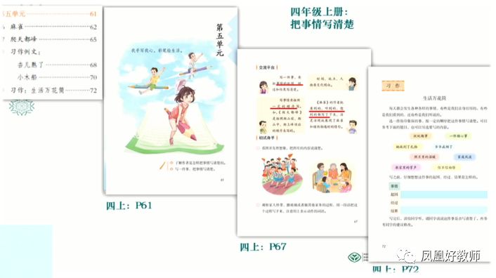 快速地看,我们主要是看交流平台。因为交流平台界定了这个单元学这个要素、发展这种习作能力的最基本的落点。就是希望学生从哪几个方面出发,去达成目标。比方四上,写清楚事情的起因、经过和结果,要按照顺序写,要写自己看到的、听到的、想到的。