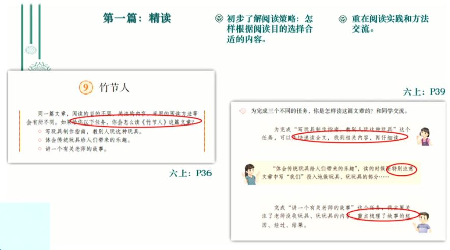 完全不同的视角、不同的内容,学生来读同一篇文章的话,如果给你不同的任务,你会怎么读?你去想一想,然后自己再来读,读完了之后来交流你是怎么做的?课后依然还是给出了一些思路,比方“先快速读全文,找到相关内容再仔细读”;比如“要完成一个任务,我要特别注意什么,我要重点梳理什么”。就是让学生知道有这样的一种阅读策略在,我可以用这样的方式来完成我今后的阅读任务。