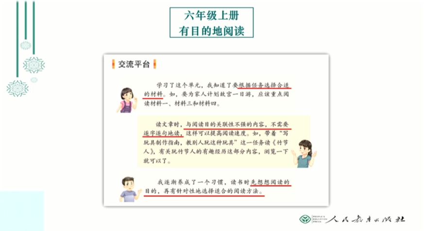 下面我们讲六年级上册“有目的地阅读”这个单元。有目的地阅读是建立在提高阅读速度的基础上,我在这边先简单给大家呈现一下交流平台的一个提示。一个是根据任务选择合适的材料,一个是与阅读母的关联性不强的内容,不需要逐字逐句地读。还有就是先想想阅读的目的,再有针对性地选择适合的阅读方法。