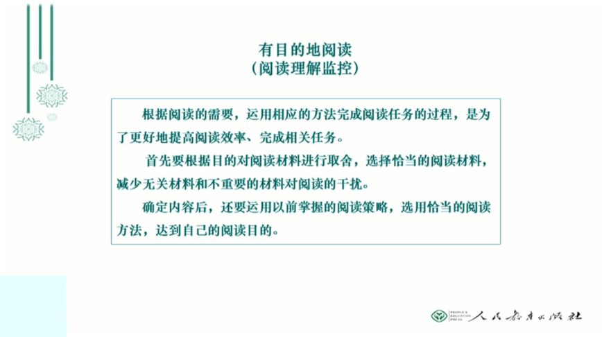 “有目的地阅读”,其中一个关键词就是选择,根据任务去选择你需要的内容。阅读材料已经摆在这儿了,不是你去搜集资料,而是你根据具体的任务去选择需要阅读的那个部分。选择了之后怎么办?第二步就是要选用恰当的阅读方法。你确定了你要重点读这部分、重点读那部分,但是这个重点读也有很多方法,基于文本的不同特点,可能是抓关键句读,可能提问等等,自己选择方法。