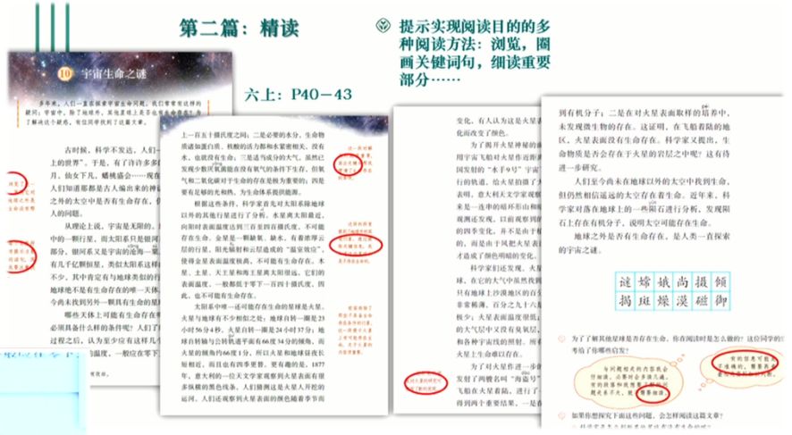 第二篇:精读。这两篇精读体现了我刚才说的那两个角度,第一个是选择哪个部分来读,第二个是这一课的主体思路,就是引导学生知道可以用什么方法来读。不同的段落可以用不同的方法来读,有的段落不太有关系,简单浏览一下就跳过去了,跟我想知道的这个问题没有关系。有的后面可能是就关于怎么样来细读,怎么样来抓住关键词、获取关键信息等等,就是通过旁批来做,给我们的学生非常丰富的提示。