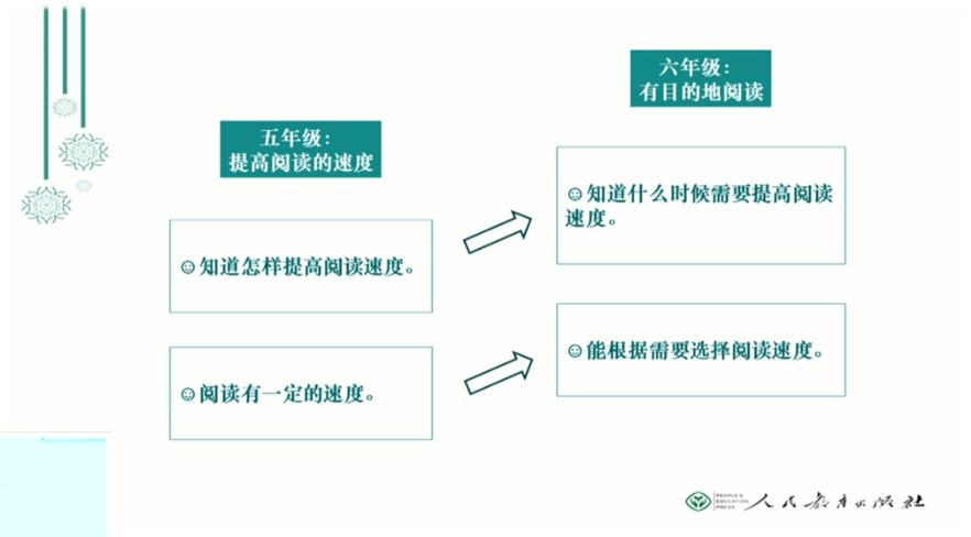 比方我读到我不太需要了解的内容,这个地方我加速,我要跳过去,不需要细读它,这是一个提升。另一个提升是“阅读有一定的速度,能根据需要选择阅读速度”。学生经过五年级上册一个单元的学习,以及一整年的提高阅读速度的练习,他可能阅读的速度还可以。到了六年级“有目的地阅读”这个单元,怎么样去运用呢,怎样体现他对阅读速度的把控呢?就是要能根据需要选择阅读速度。我这里想快就快,我一会想慢就慢,收放自如。靠这一个单元,学生其实做不到,但是希望学生知道这个单元是在做这件事情,可以向着这个方向去努力,今后可以一直持续不断地去练习。