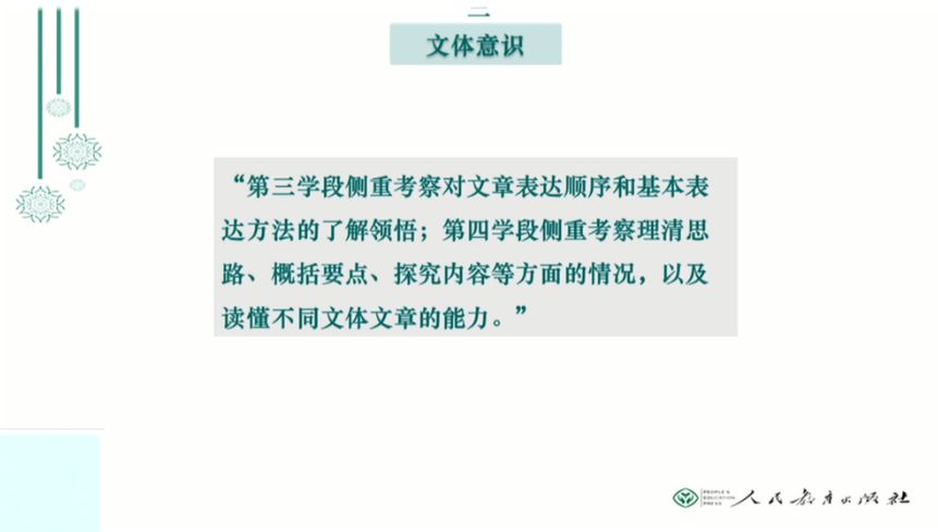 第三个:文体意识。第四学段重点是读懂不同文体文章的能力,所以在小学阶段,我们更多的是文体意识。我们不说去读懂不同文章怎么怎么样,不去提这么高的要求,我们要为后面做铺垫。