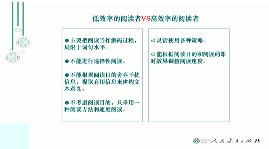 这一页做了一个对比,我们希望学生能够不像左边的孩子一样,而像右边的孩子一样。左边的孩子处于初级词句的解码阶段,我们可以看到孩子的阅读比较吃力,他可能就是一定要逐字逐句地读下来,然后去连接它,才能形成意义,一直都是这种自下而上的阅读,也不能选择,不能根据需要提高速度。我们希望经过我们的一些策略的学习,孩子能够灵活地使用策略,能够根据目的和即时效果调整阅读速度,这个是我们所希望达成的。