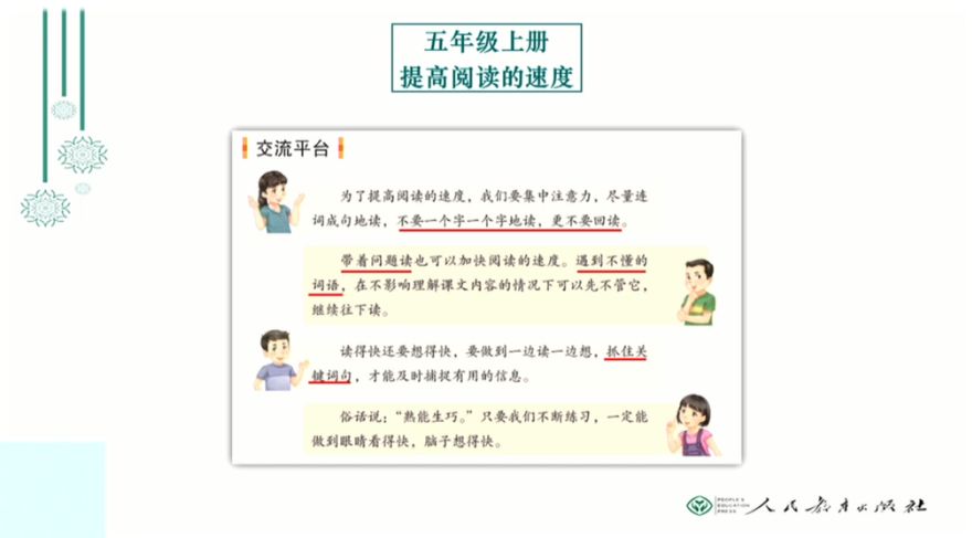 我们的练习速度达不到,以前重视的不够,所以学生在这方面存在一些问题。那我们在交流平台里怎么做,我们主要是从一些学生可操作的,可行的技巧和方法给孩子。比方,要连词成句地读,不要一个字一个字地读,更不要回读。这个提示我们在读的时候要扩大视域,我们可以去练这个,在读的时候你应该看到一个词,比如读到蔺相如的时候你应该看到的是蔺相如,孩子到五年级应该已经能够达到这样的程度。因为汉字解码,汉字识别的那个阶段应该是低年级、中年级已经完成了,就是他在有很少量生字的前提下,他应该可以做到这一点。不要再一个字一个字地去识别,而是一个词,甚至一个短语甚至一句话。这是一个意识,也是一个重要的培养能力的过程。