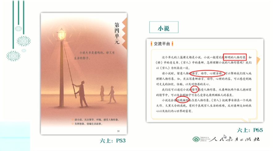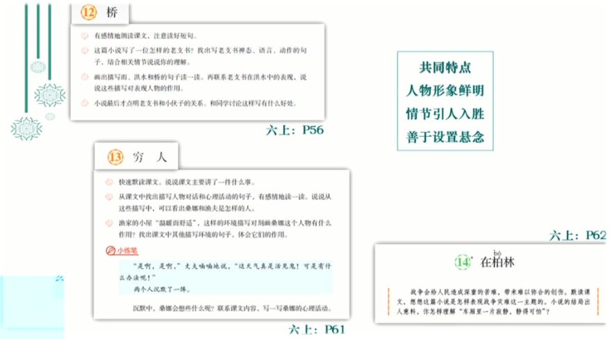 还有“小说”单元,“小说”单元安排在六年级上册,它主要指向的是鲜明的人物形象。小说里边,它一般就是以塑造人物形象为目标,所以我们让学生在读这些短篇小说的时候就要去体会鲜明的人物形象。怎么体会呢?有一些情节、环境描写等,都要让学生有初步的了解。