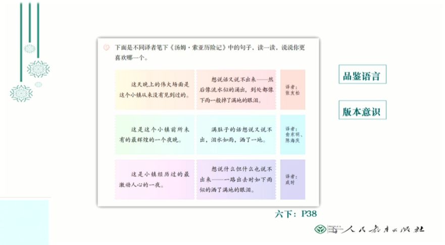 这个单元里,稍微说一句的是这个版本意识。所有译文都涉及版本,我们可能不要随便跑到街上就去抓一本书,看着这个便宜,然后这个又厚又便宜我就买来看。要看一下它是哪个出版社出版的,它是哪个译者译的,这样才能让它的译文品质有基本的保证。因为译文本身可能相对来说就比较难读,至少是给我们一个好的基础,有这样的意识可以让我们的学生不至于读到太差的作品。