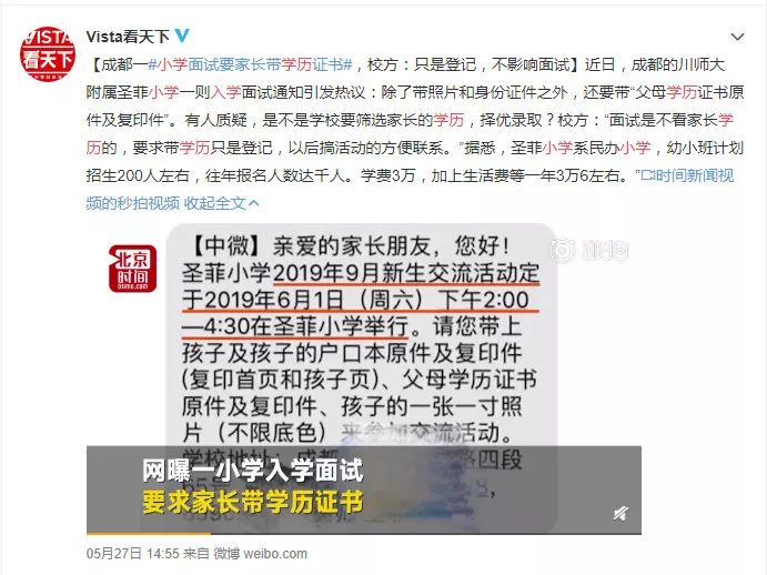 近日,有一条新闻引发网友热议。成都某小学入学面试,要求家长除了带照片和身份证件之外,还要带“父母学历证书原件及复印件”。