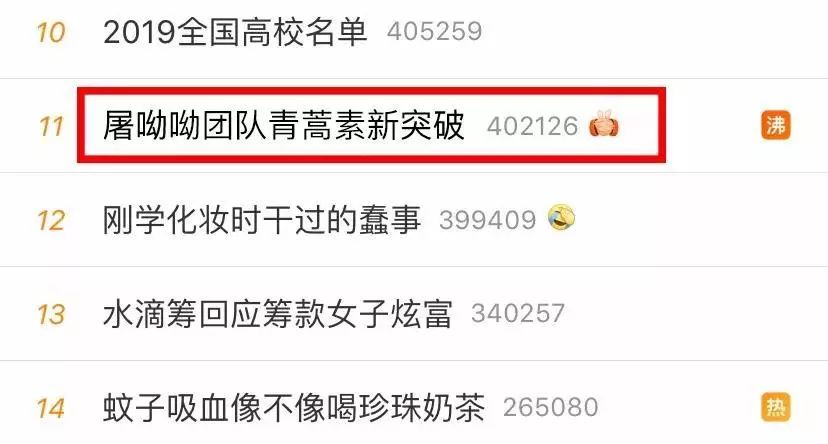最近,屠呦呦团队青蒿素的新进展上了微博热搜: