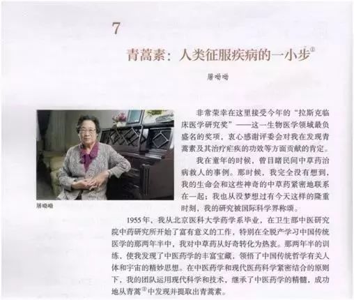 作为第一位获得诺贝尔自然科学奖项的中国本土科学家,屠呦呦及其科研团队的杰出贡献和事迹已被多本教材选入,正式走进了中小学生的课堂与生活。