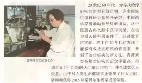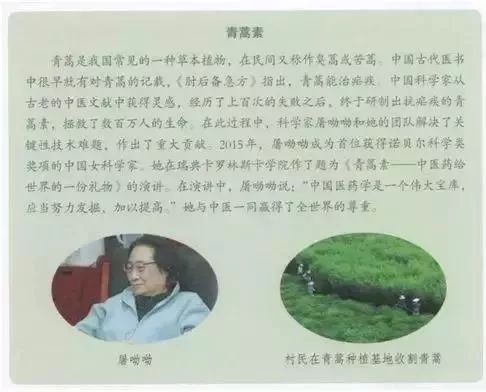 此外,初中历史教材也在《中国历史》八年级下册第18课“科技文化成就”中,对屠呦呦科研团队先进事迹进行了专题介绍。
