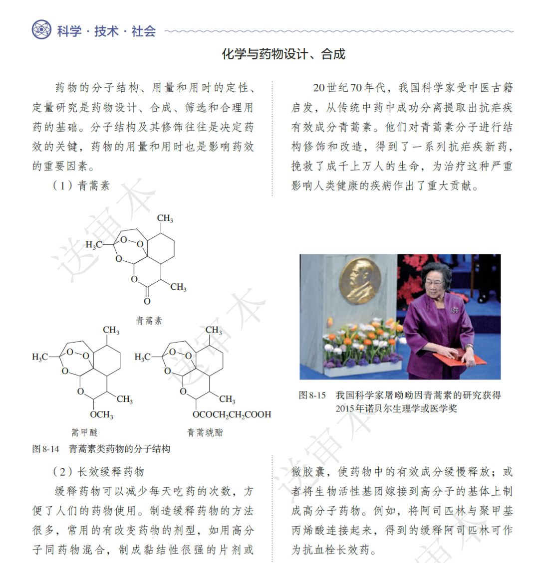 今年秋季使用的人教版高中化学必修第二册教材中,同样有关于屠呦呦的介绍。第八章第二节《化学品的合理使用》中,对“化学与药物设计、合成”进行了专门介绍,其中就提到青蒿素,并对屠哟哟发现青蒿素和获得诺贝尔奖的事实进行了介绍。