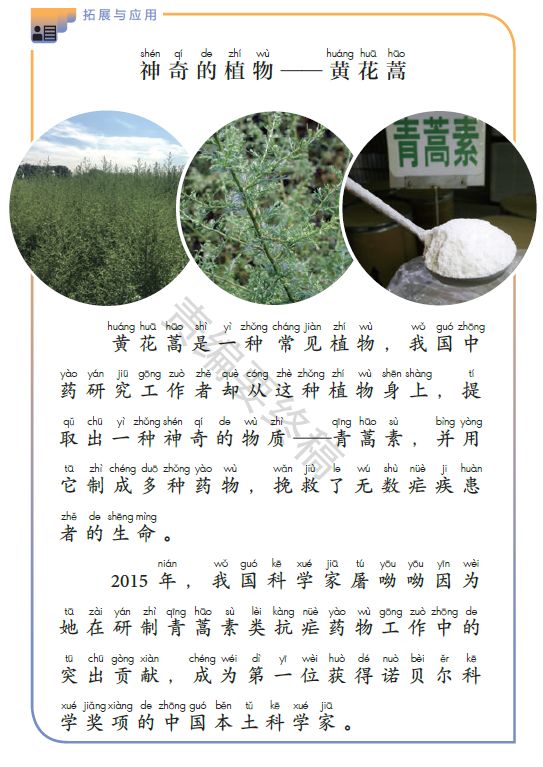 人教·鄂教版《科学二年级上册》第3课“拓展与应用”栏目,以“神奇的植物——黄花蒿”为题,向学生介绍了以屠呦呦为代表的我国中药研究工作者研制出的青蒿素对世界医药事业的贡献,体现出植物与人类生活的密切关系,渗透了爱国主义教育。
