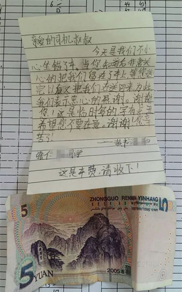 金师傅把车开到泰冯路底站,打开纸条发现里面写了字,还包着五元钱纸币。原来,这五元钱是孩子付的车费,纸条上写着:亲爱的司机叔叔,今天是我们不小心坐错了车,当您知道后非常关心的把我们留在车上,等您送完以后又把我们送回来……谢谢,您辛苦了!孩子在纸条最后注明,这是车费,请收下。