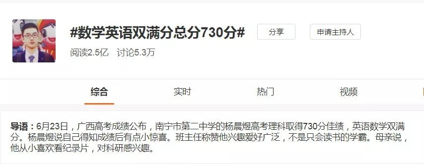 这是广西恢复高考以来的最高分,不仅刷屏朋友圈和新闻,还登上了微博热搜。